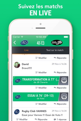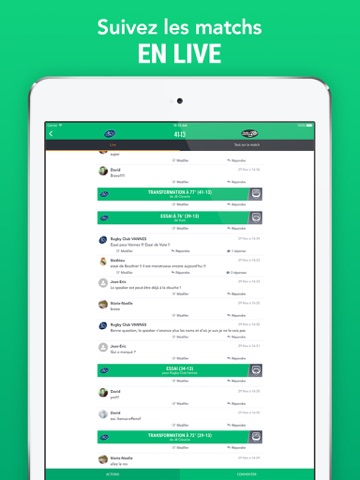 - Et interagissez avec les autres supporters pendant un live : partagez l’évolution du score, encouragez l’équipe, posez une question… Devenez un reporter sportif, le temps dun match ou plus si vous le souhaitez !