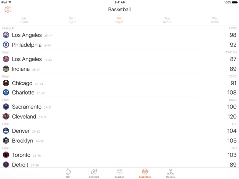 Great app. No ads to scroll through and my teams scores are easy to get to. Scores are easy to read and my eyes dont get distracted by all the extra bells and whistles that come on other apps.