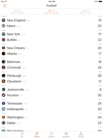 Just downloaded this app because the others are missing one important detail. Team record. Its like all of them decided to remove the record from the score page. Well, Im removing them from my phone.
