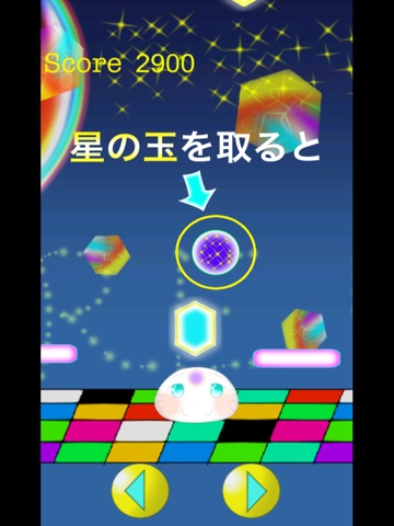 丸い星のアイテムを取るとキャラクターが一定時間無敵になるので、その間に障害物を気にせずアイテムを取りまくって、高得点を目指そう!