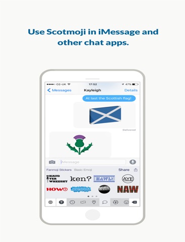 Add your favourite Scotmojis to your picture to paint your face and surroundings and send directly from the keyboard.