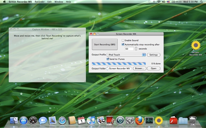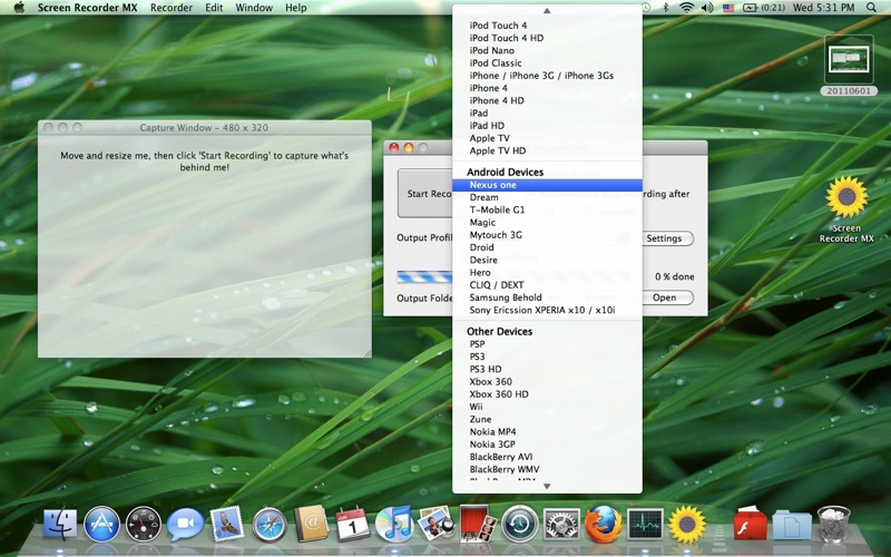 Screen Recorder MX is a Screen Recorder and Sound Recorder for Mac OS X, the recorder can help you capture screen to video and record sound to audio for Mac, and convert the recorded audio / video to WebM (VP8), AVI, DivX AVI, XviD AVI, 3GP, 3G2, MP4, WMV, MKV, TS, FLV, SWF, MOV, GIF, MP3, MP2, OGG, WMA, WAV, AAC, AC3, AU, MMF, M4A, or video used on iPhone, iPod, iPad, Apple TV, Android devices, PSP, PS3, XBOX360, ZUNE, Nokia, BlackBerry, Sony Ericsson, Motorola, LG, Samsung, Blu-ray disc, NTSC DVD, PAL DVD, and more. added capture mouse and highlight mouse clicks function.