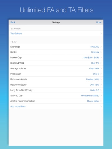 ScreenerPro offers a unique one-touch-done screening experience for our users. First, create a screener with a name you desire. Second, select scanners (e.g. top gainer) and filters (e.g. sector, market cap, P/E ratio, etc.) for this screener. Once done, your screener is auto-saved. Whenever you want, simply touch the screener name, the screening automatically begins and present you the results. Easy, fast, and definitely no repeated selecting or configuring. You can easily modify the settings (add or delete filters, choose different filter values, select different scanners) for the screener at anytime.
