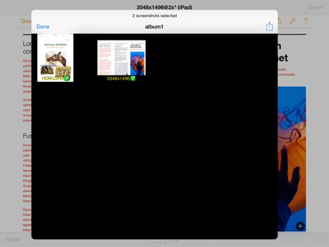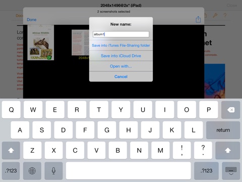 ● Send one PNG screenshot or multiple screenshots in a ZIP file to other applications: Mail, Dropbox, etc.