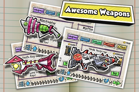 •Stock your arsenal with awesome weaponry like the Doodle Destroyer and the Red Marker of Death!