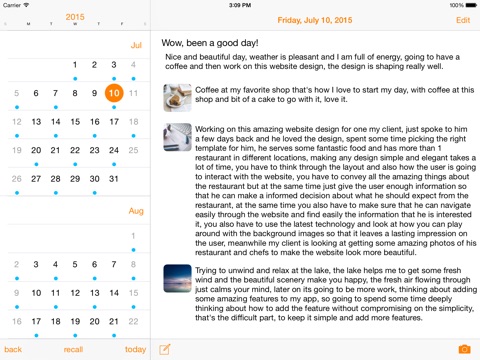 Split View: Split View Interface for the iPad and the iPhone 6 Plus with calendar on the left and day topics and photos on the right to make note taking ability even more simple