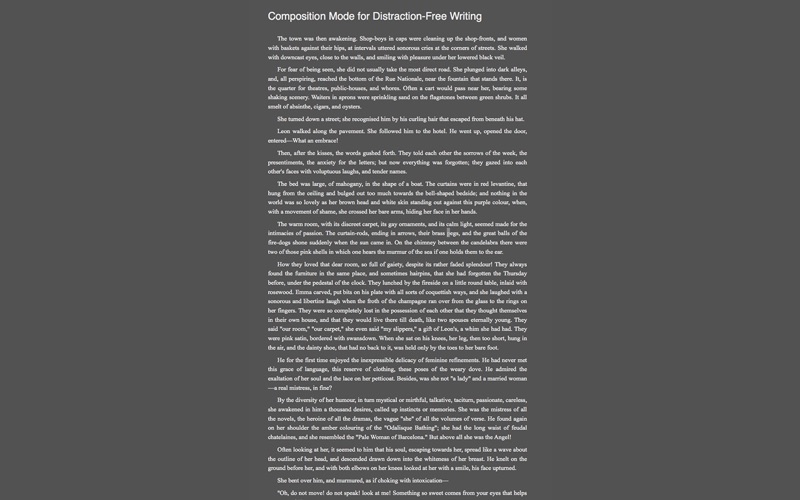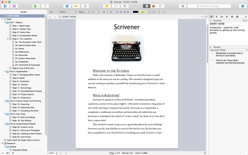 Cette application très légère (20 Mo) est néanmoins très performante et très bien pensée. Pour ceux qui doivent rédiger de gros documents (livre, thèse, cours), cest loutil idéal. Les informations sont organisées de manière claire et intuitive. En un seul coup doeil, on peut avoir une vision globale du projet. La prise en main de linterface se fait très rapidement après avoir visionné un screencast de 10 minutes sur le site de léditeur. Javais une crainte par rapport à la typographie française sachant que la langue de ce logiciel nest pas configurable. Heureuse surprise : les guillemets souvrent bien à la façon française et le tiret cadratin sobtient par substitution automatique en saisissant une succession de trois signes « - ». Jabandonne donc mes parchemins, ma plume doie et mon encrier pour cet outil de lauteur du 21e siècle. PS : Attention, ceux qui ne lisent pas la langue de Shakespeare sabstiendront, car toute linterface est en anglais.