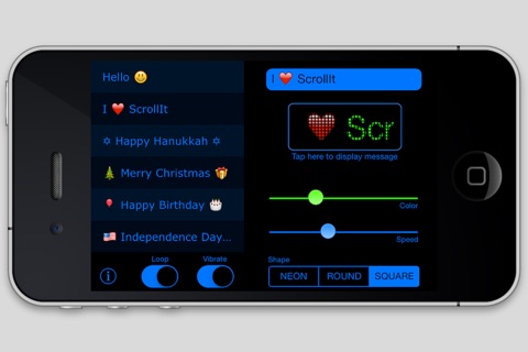 The phone vibrates quietly to let you know when the message has finished. (Replaced with a short beep on iPod Touch and iPad.) The endless-loop option lets ScrollIt repeat your message indefinitely.