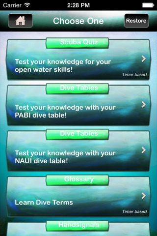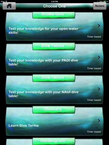 Scuba Sessions is a learning tool to help beginners and those that need a little refresher. It has OVER 250 questions with sections on Handsignals that include HD video. It also comes with a NADI and a PAUI dive table theory section where you can practice basic dive table theories with your dive tables!