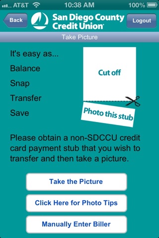 Transferring your credit card balance to your low-rate SDCCU Visa® is as easy as Balance. Snap. Transfer! Simply take a photo of your current credit card bill and let the app do the rest.