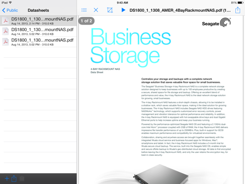 The Seagate MyNAS app lets you access documents, photos, videos and music stored on your business’s Seagate Business Storage NAS. When traveling on a plane or in another situation where you don’t have Internet access, the MyNAS app can store files for offline use. For files you have stored within the app, you have the option of using the “Open in” function on your iPhone, iPod touch or iPad to open your files with another app installed on your mobile device. Additionally, you have the ability to upload photos and videos from your camera roll to your Seagate Business Storage NAS device from anywhere.