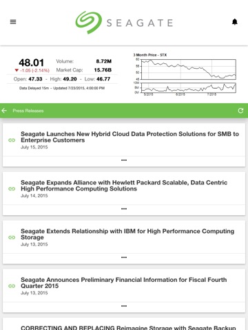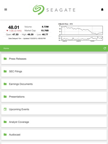 This app gives Seagate Technology PLC (NASDAQ: STX) investors mobile access to the latest stock data, news, SEC Filings from Seagate Technology PLC, as well as proprietary company content including presentations, conference calls, videos, sales and marketing collateral, fact sheets, annual reports and other qualitative company information. Investors are able to receive push notifications when new content is added to theIRapp; add events to their calendars, share content as well as download it for offline viewing.