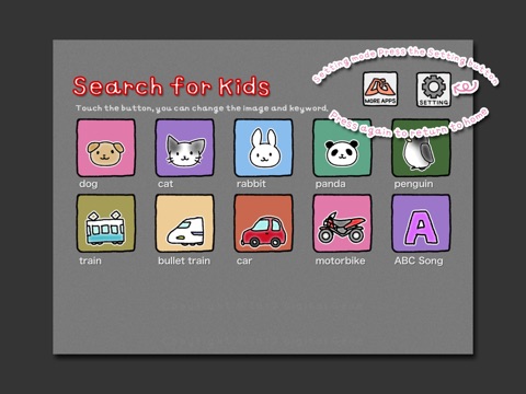 Although he would like to see an animation by YouTube, it is an application which can search an animation from the button which registered two or more keywords into those for children which can put in neither voice search nor a keyword beforehand.