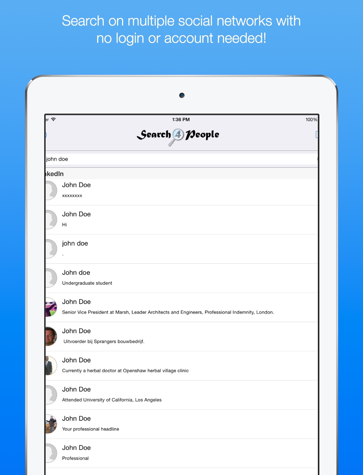 Quick and easy search for people in multiple social networks in the same time, with no registration or authentication required for performing a search: