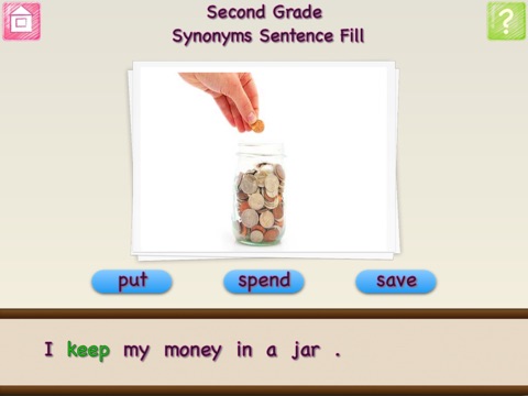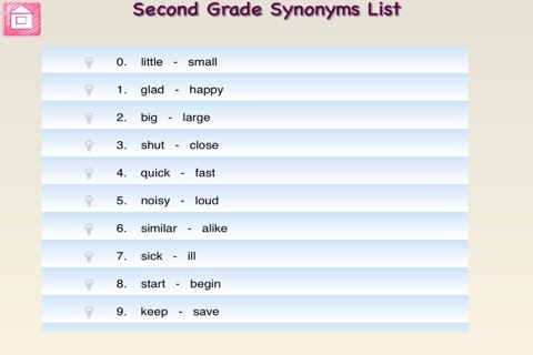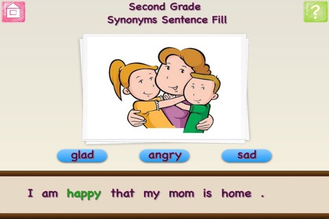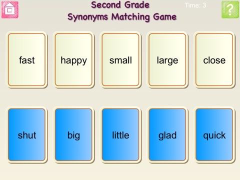 Second Grade Synonyms is a fun educational game for children to learn synonyms, and improve their vocabularies. The app includes four different activities - flash card, matching game, memory game and sentences.