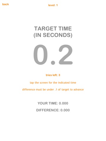 The object of the game is to tap and hold the screen for the indicated time and then let go. If the time you hold the screen for is less than 0.1 seconds above or below the indicated time then you get to advance to the next level. The game starts at 0.2 seconds and goes up by 0.2 seconds every level. You are given 3 tries to reach the target time. After that its GAME OVER.