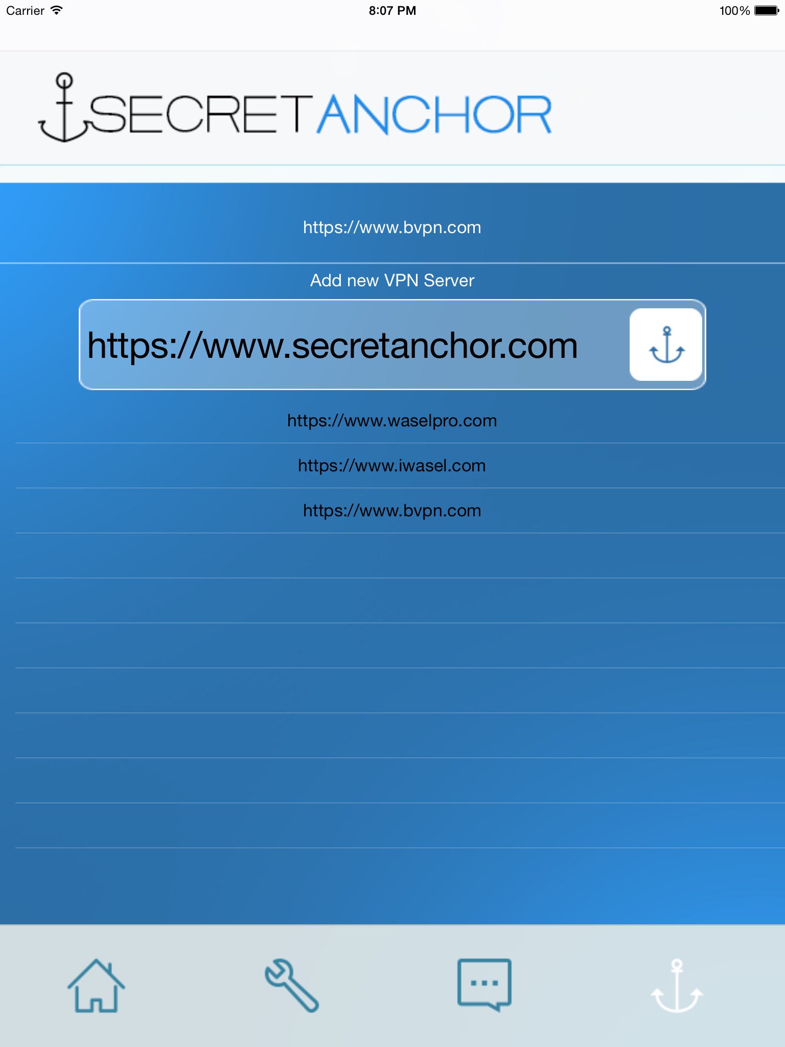 Secret Anchor is a tool that gives the existing users of iWASEL, WASEL Pro, bVPN Services the ability to instantly download VPN connection settings on their devices (iPhone, iPad or iPod touch) .