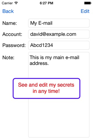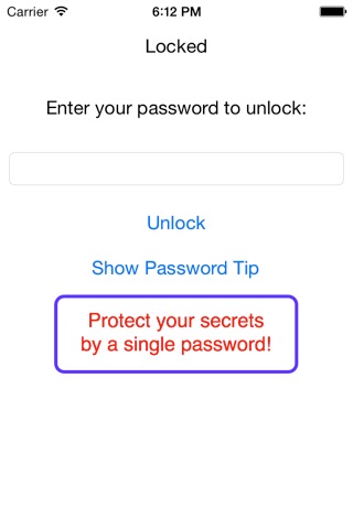 This app can store your account information and text notes as secrets. The secrets are very safe. This app can protect your secrets by a single password. The password is needed to unlock your secrets. And, when you leave this app (for example, you press the home button of your device when you use this app), this app automatically locks your secrets.