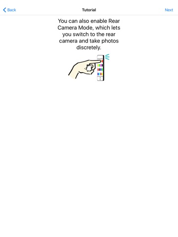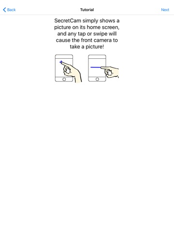 SecretCam displays an image that you choose and any tap or swipe on the screen will cause the front or rear camera to take a picture. The only way to access SecretCams menu is by pinching the screen, but only you know that. ;)