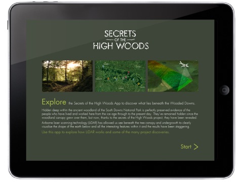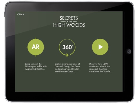 The Secrets of the High Woods travelling exhibition combines 360 degree interactive CGI, augmented reality and CGI animation to showcase some of the discoveries from a three-year community archaeology project which has combined cutting-edge airborne laser scanning technology with traditional archaeological exploration. This app allows you to allows you to take a part of the exhibition home with you to share with others.