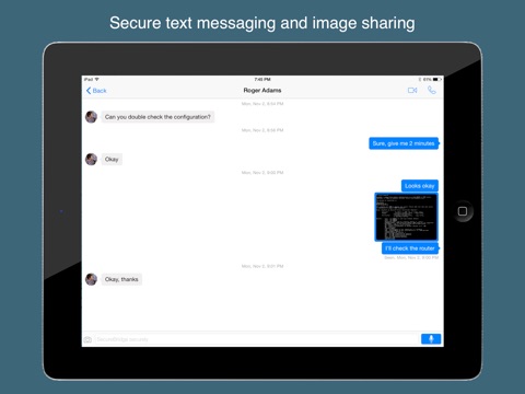 • Simple, Secure and Compliant Mobile Messaging for Security-Conscious Organizations - Military level grade RSA 2048 public/private key encryption of data at rest. Triple encrypted communications