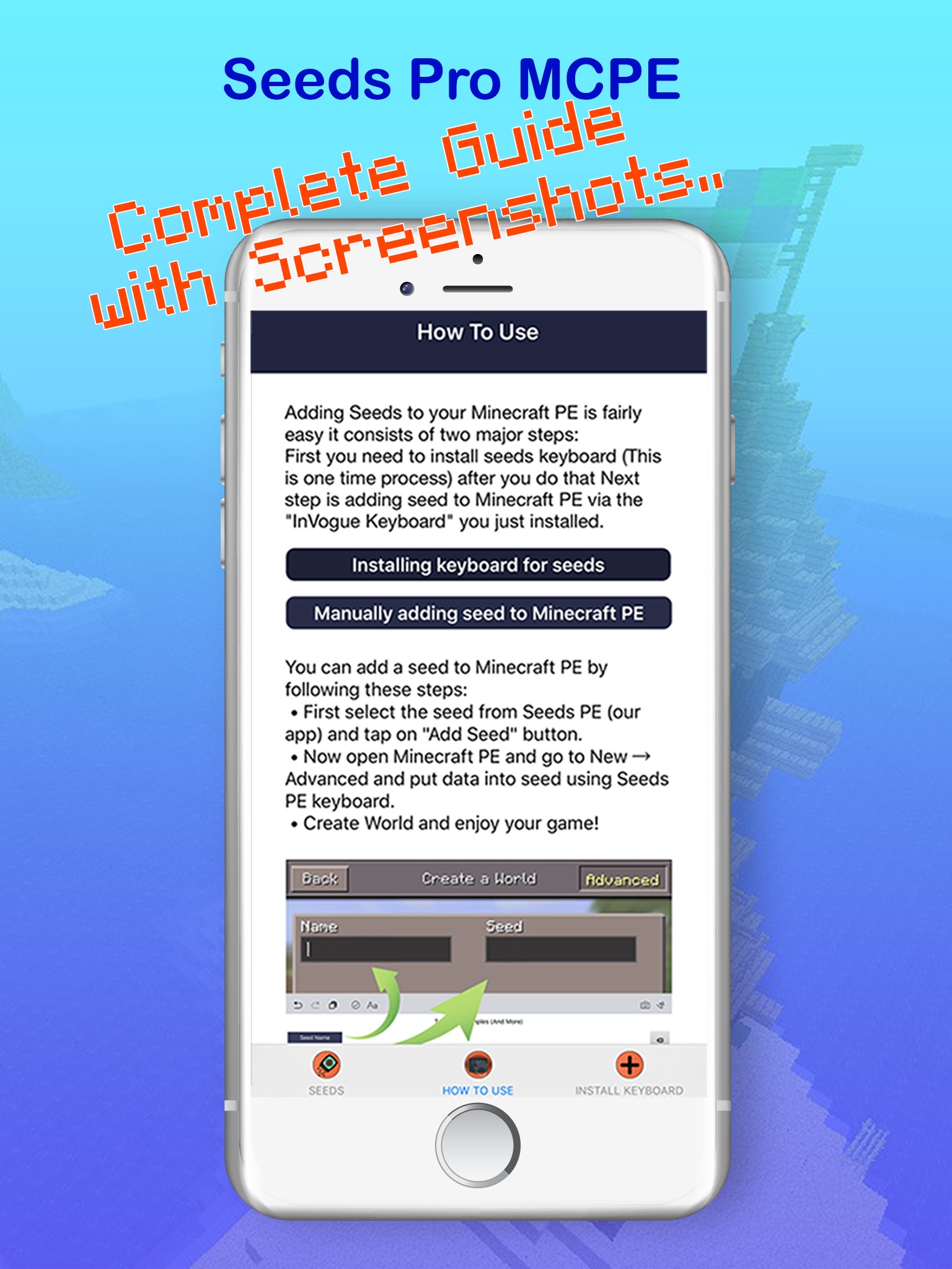Installing Seeds in minecraft is as easy as a click and paste with our new App bundled with popular seeds "Seeds for Minecraft PE"