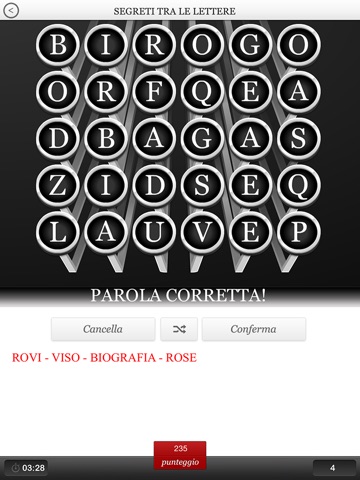 Una volta selezionate nellordine corretto le lettere che compongono una parola, premi "conferma" per verificarne la validità o "cancella" per annullare linserimento.