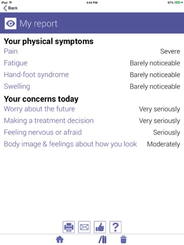 This tool can help you care for yourself while you get treated for cancer. Use it weekly during treatment to assess your symptoms, and learn about helpful, self-care strategies. Email a copy of your assessment to your doctor or nurse, or print a copy for yourself. Then schedule your next check-in.