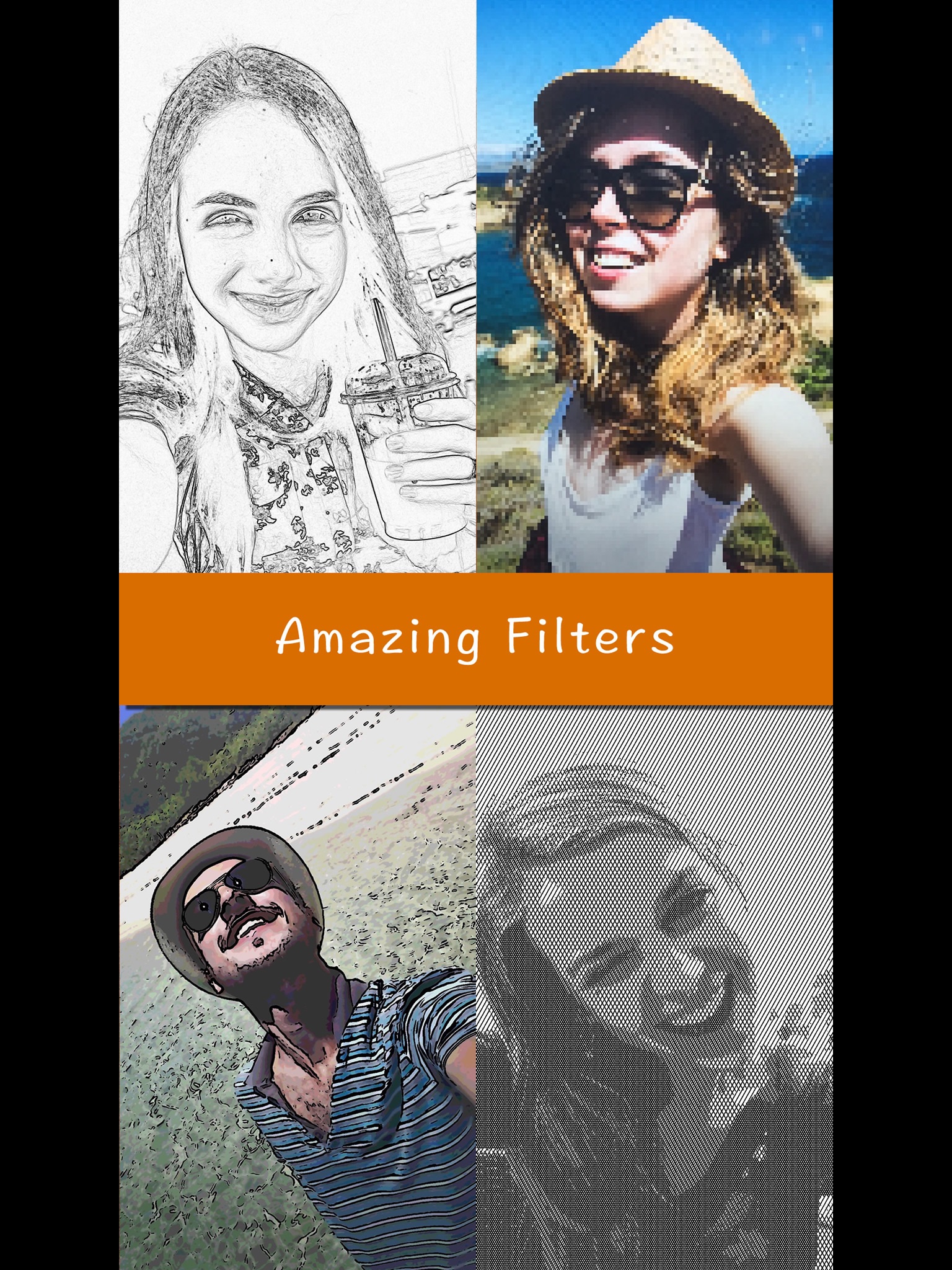 -> 8 amazing filters: Sketch, Painting, Dots, Halftone, Crosshatch, Swirl, Pixelate and Emboss