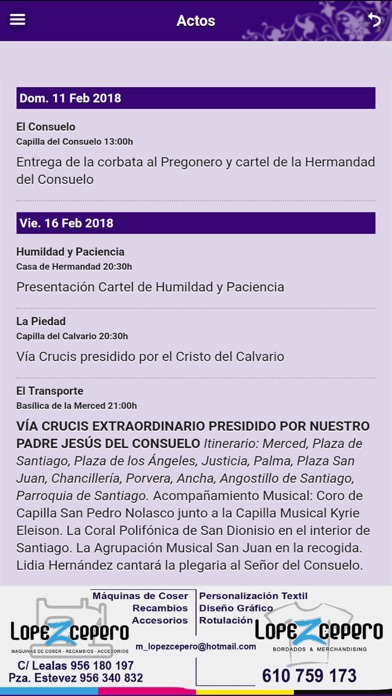 Aplicación Oficial de la Semana Santa y la Cuaresma de Jerez de la Frontera. En ella podrá encontrar toda la información en torno al mundo de las hermandades y cofradías, contando con una completa guía de actos a desarrollar durante este período. Es reseñable que en ella podemos encontrar una completa guía con los besamanos y besapiés que tendrán lugar durante las vísperas a los días pasionales. Además podrá visualizar todos los datos referente a las corporaciones en la calle, horarios sincronizados y posicionamiento en tiempo real.
