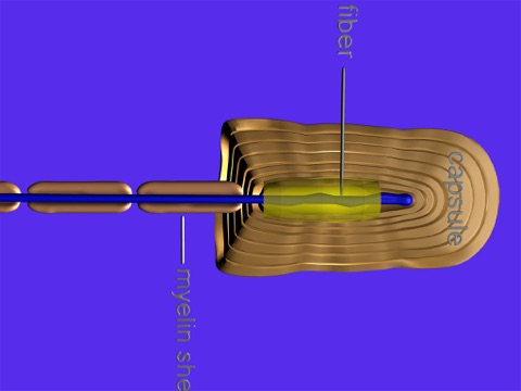The next scene is about the Pacinian corpuscle. This is a mechanoreceptor, especially good for sensing the bvibration. The first view shows the Pacinian corpuscle as a whole, with the myelinated nerve protruding downwards. Then the outer sheath disappears and we see many concentric sheaths enveloping the free nerve ending, which is the place where mechanical stimulus is translated into the nerve excitations. As the sheaths of the corpuscle get deformed during the animation, the nerve gets excited and coloured nerve impulses travel down along the sensory nerve.