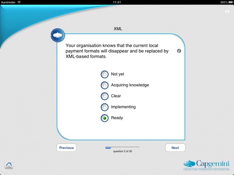 There are 20 questions (one question per screen) in which you can specify by using ticks; if this is applicable, partially or not applicable for your organization.