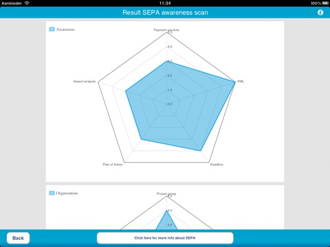 The questions are categorized in four themes; Insight, Organization, Business changes and IT changes’. When all 20 questions are answered, you will receive a screen with so-called spider webs with your scores.