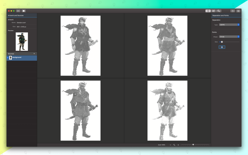 Separation Studio is an application that allows you to create single color and cmyk half-tone patterns in vector- based formats. The separations can be based on shapes defined in the application.