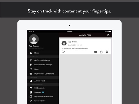 This application is used to enrich the ServiceNow conference experience by providing attendees with conference details—including up-to-the-minute updates—via their mobile device. Key functionality includes access to personalized agendas and direct connection to conference sponsors, presenters, and other participants.