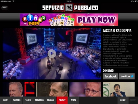 Resta connesso a Servizio Pubblico con l’applicazione per i tuoi dispositivi iPad e iPhone. Servizi e dibattiti di approfondimento sullattualità e la politica in diretta ogni giovedì dagli studi di Cinecittà. Il punto di vista della redazione di Michele Santoro a portata di mano, ovunque tu sei, tutti i contenuti sia live che on demand disponibili con pochi tap.