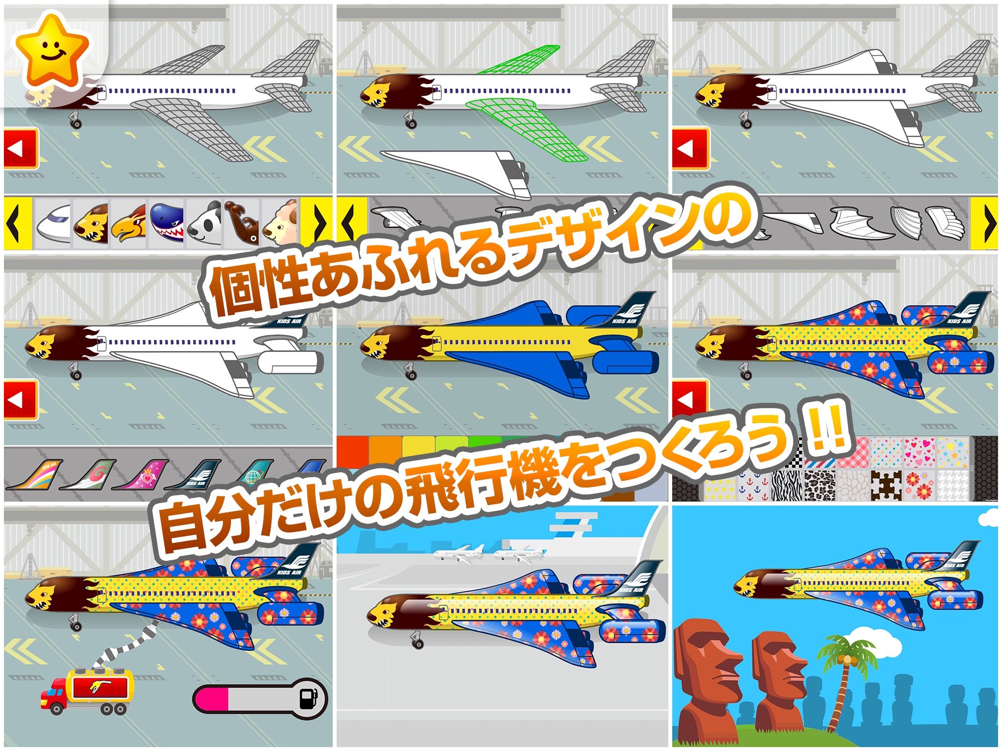 Build an airframe with 14 different airplane nose motifs, 10 different main wings, 6 different tails, and 6 different vertical tails. Design the airframe, the wings, and tails with 20 different colors and 16 different patterns. Combine all the different parts to come up with your very own, one of a kind design. You can even create the captain and cabin attendant with the 12 different head, body, and leg parts. With over 1,700 different combinations, you will be able to enjoy making your favorite, over and over again.
