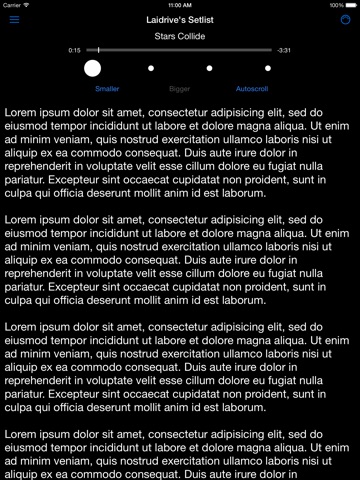 A collapsing interface maximises the space for text when you need it. Autoscrolling and "Auto Next Song" will allow you to setup your performance with minimal effort.