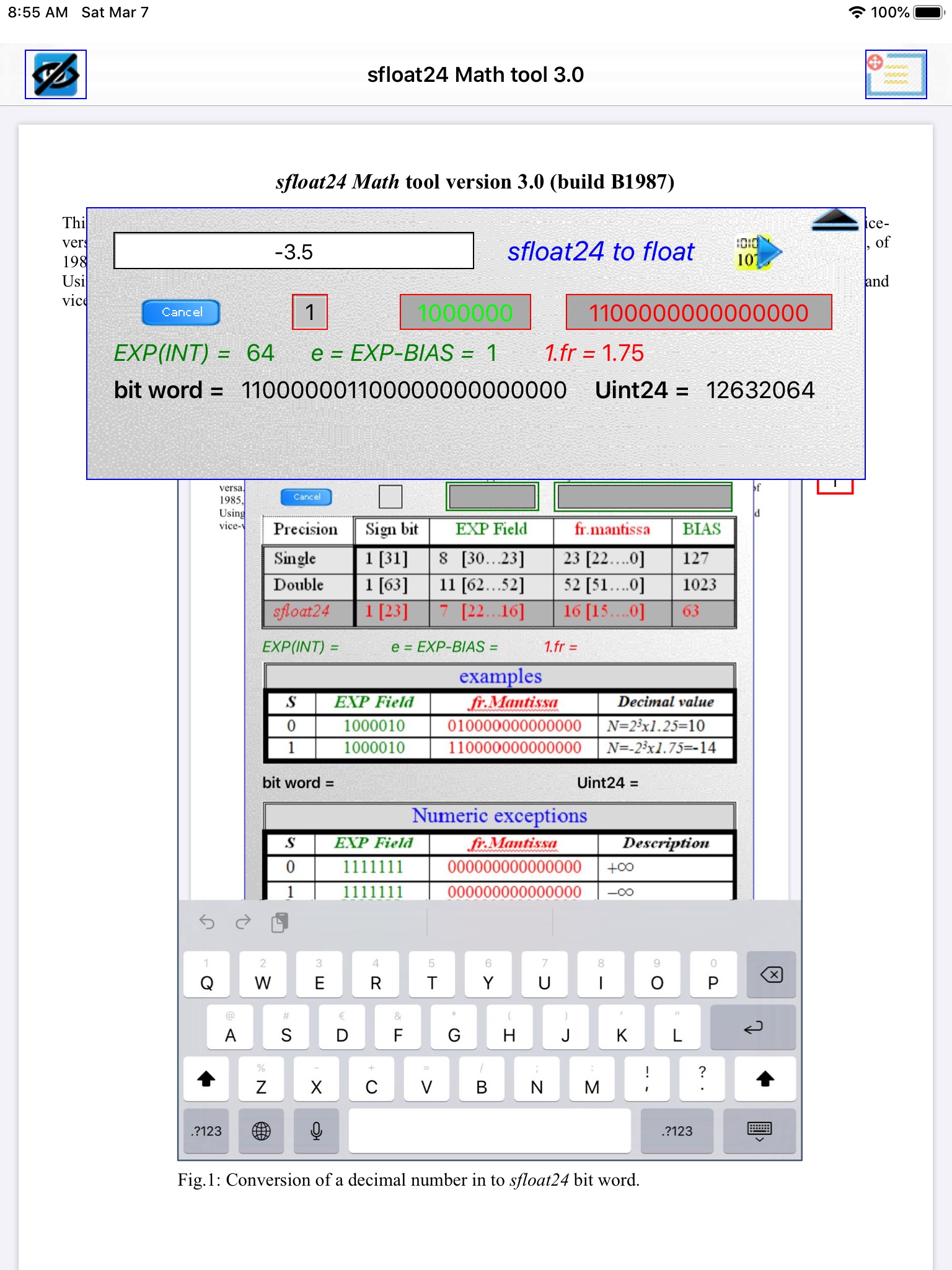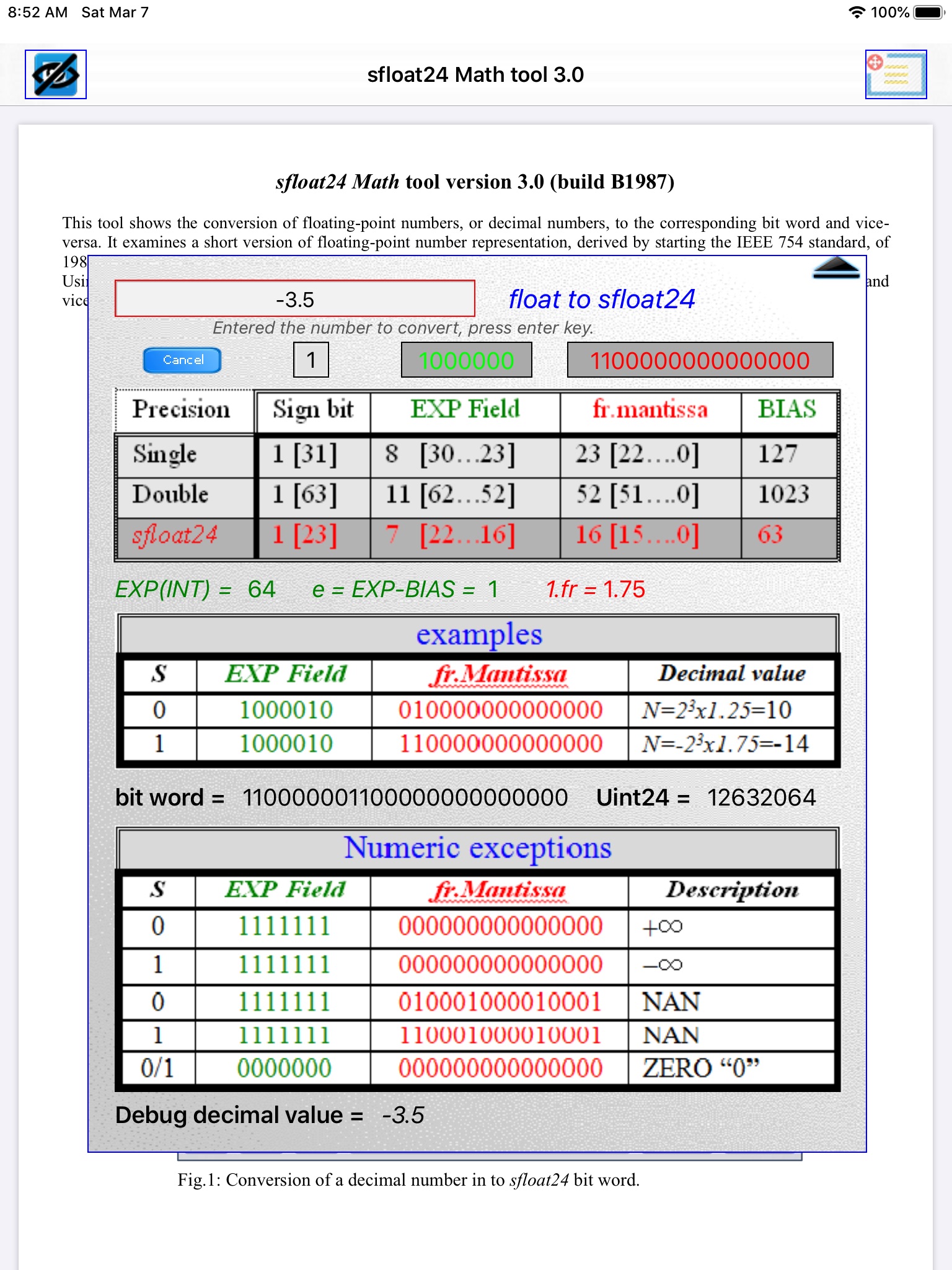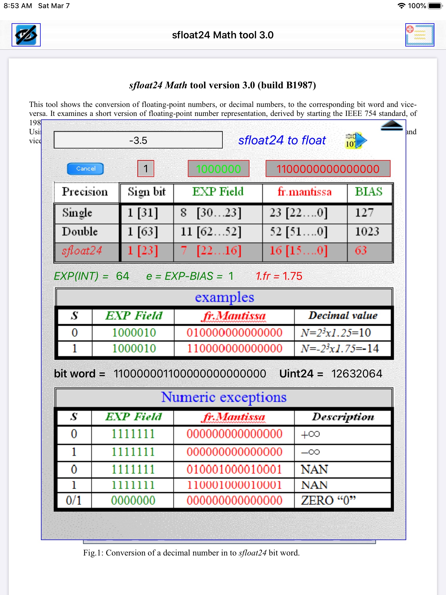 This tool shows the conversion of floating-point numbers, or decimal numbers, to the corresponding bit word and vice-versa. It has been conceived starting by considering the IEEE 754 standard of 1985 and has been implemented a short version of floating-point number representation, called sfloat24. It is very useful to understand as any calculator stores a decimal number in its registers.