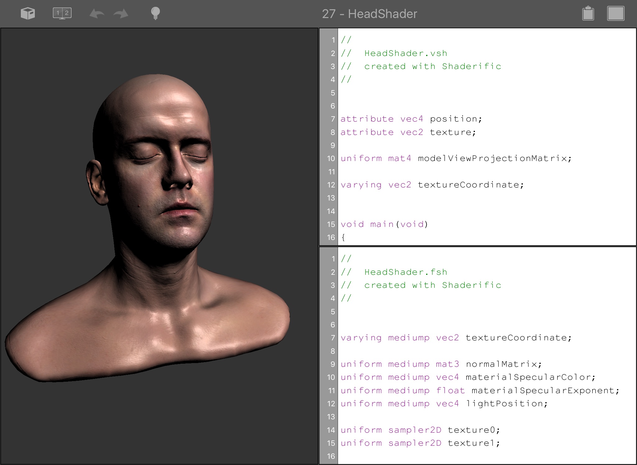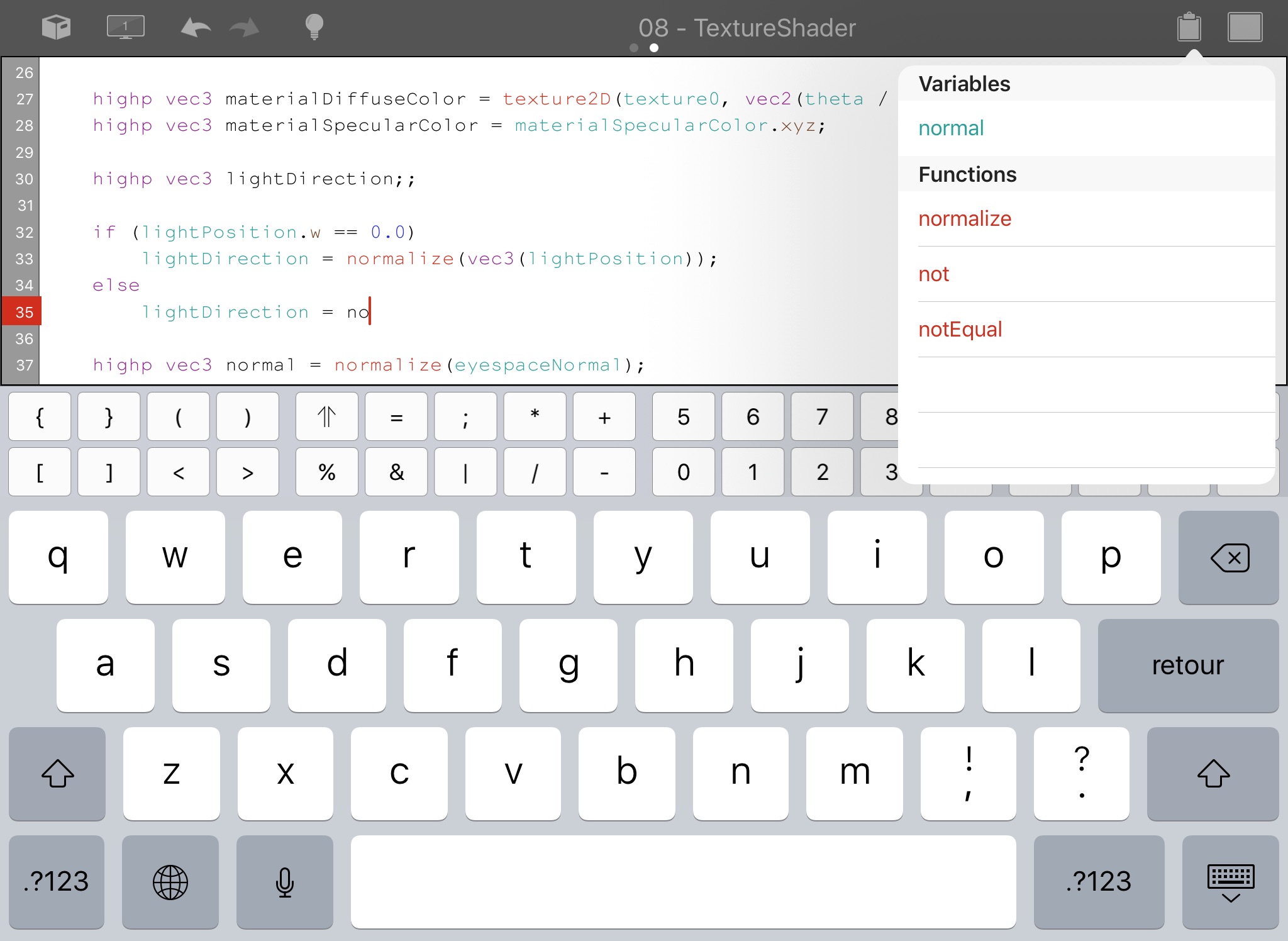 - Context-sensitive help for all GLSL keywords providing a description and usage examples (iPad)