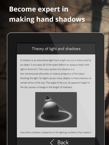This game / application is for children or adults, who wants to make fun with hand shadows, create illusions of animals on the wall, play some theater or just to have fun with kids and friends. Application will tell you everything from history and basics of hand shadow play, theory of shadows and understanding how to create great shadows and become master of shadowgraphy.