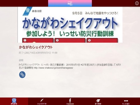 茅ヶ崎で行われる「茅ヶ崎ShakeOut」の情報アプリです。[ShakeOut(シェイクアウト)]は2008年、米国防災関係者らの発案でスタートした防災訓練です。シェイクアウト訓練の特徴は、様々な人たちが様々な場所で、同時に訓練を行う点にあります。自宅やお店、学校、オフィスビル等で指定された日時で同時に訓練を行います。シェイクアウト訓練の参加者は、地震災害発生時にとても重要な、そしてシンプルな「安全行動の1-2-3」をとります。小さな子供から大人まで誰でもできる基本的な安全行動として知られています。