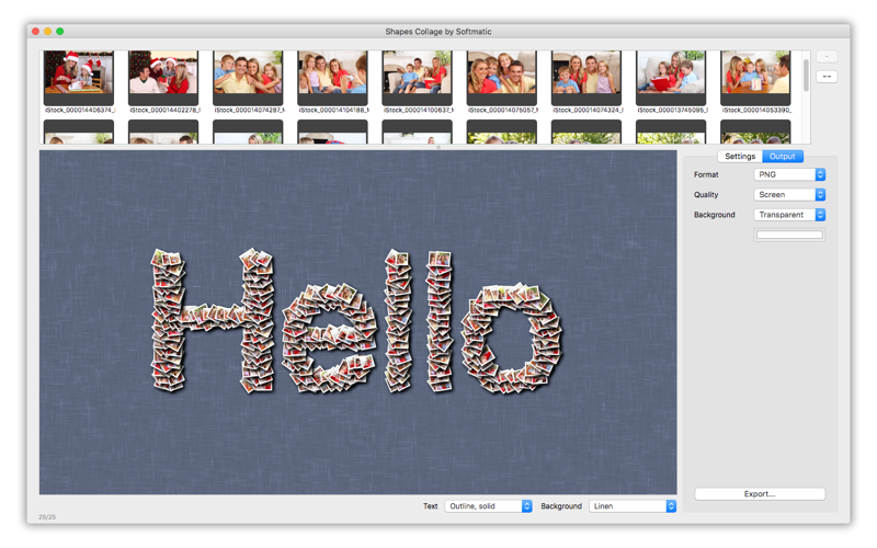 Shapes Collage arranges your images along a shapes outline, fill, or along arbitrary text. Simply drag drop your images, select a shape or enter text, done. A variety of pre defined image masks clip the photos to hearts or other shapes.