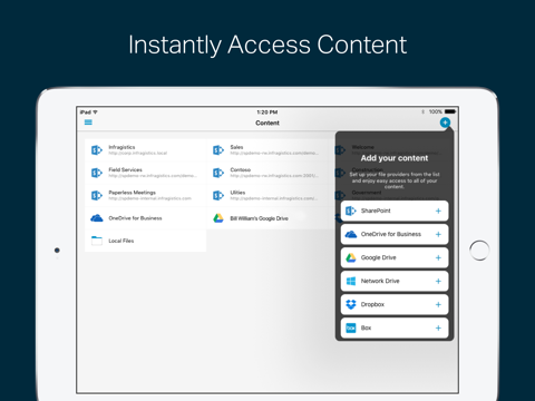 Infragistics SharePlus for AirWatch is a mobile productivity solution that transforms how individuals and teams work on the go through instant content access and discovery – with or without connectivity. SharePlus Pro lets you securely work from anywhere with the information you need regardless of where it’s located - on SharePoint or Office 365, OneDrive for Business, Google Drive, Dropbox, Box, Network drives, or other corporate data sources. You can even edit your SharePoint content offline and sync when you’re back online. Quickly and securely access all of your content from just one app.