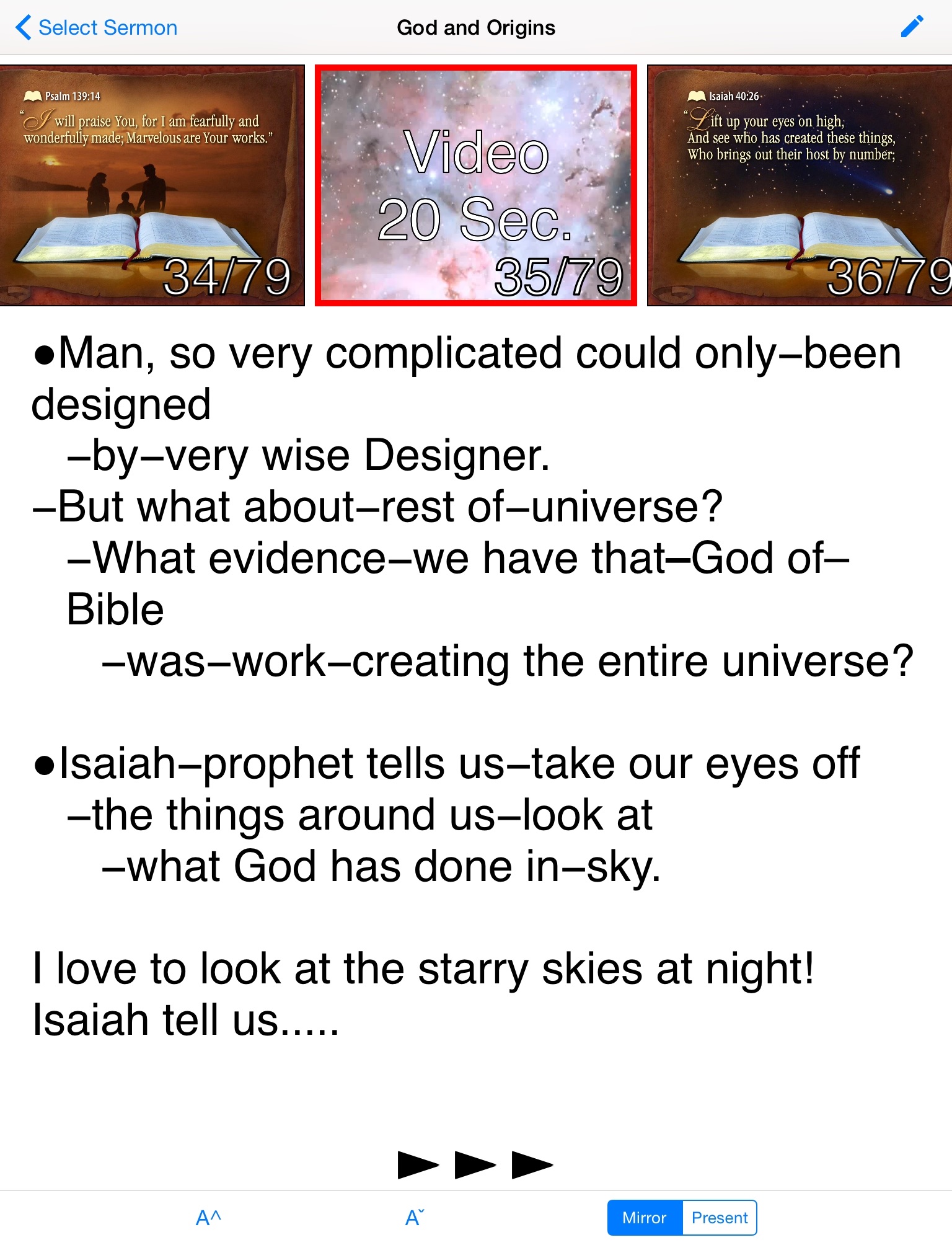 For example, this allows a speaker to read the sermon notes in English but the audience would see Spanish slides. At the touch of a button, ShareSynch can have the speakers notes in Spanish with audience slides in Spanish too; or English speaker notes with English audience slides.