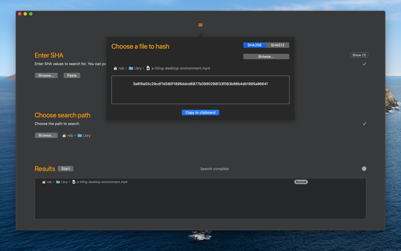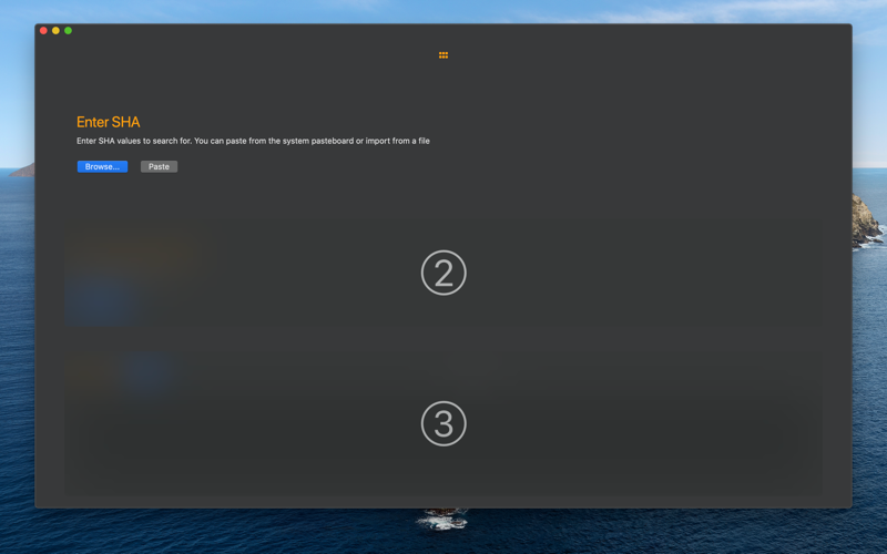 The hashes or digests to be searched for can be provided to the application in a couple of ways depending on your use case. A simple way would be to copy the hash into the pasteboard and then paste into the application in the normal way. A more sophisticated system might involve importing hashes from a text file or csv file. In this case the application will search the provided file for hashes and add each one it finds. Duplicate hashes will be ignored.