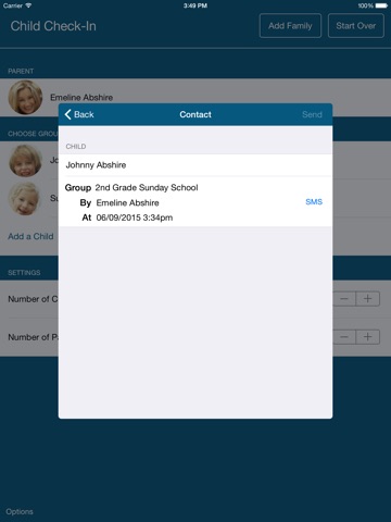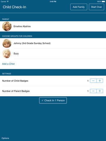 You can choose the group to check each child into, add new children and families, and edit the notes that print on the badges.