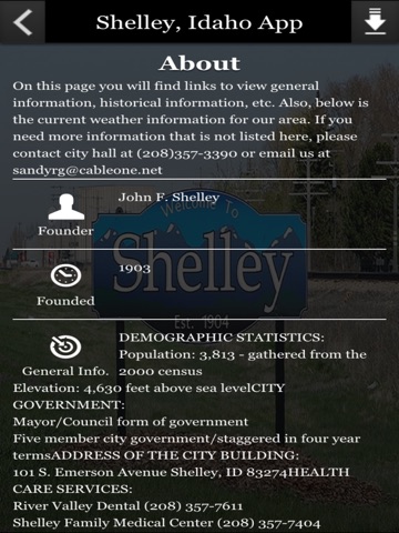 Welcome to the new City of Shelley app for the Apple iPhone and iPad. From the app, you can get all of the information you need regarding Shelley, Idaho. Everything from weather to paying your utility bill, as well as information and important updates.