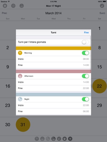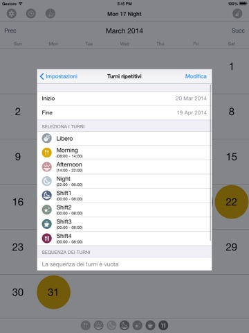 Just choose how many shifts you need, set the start/end time and tap a day to add/remore the shift on the calendar.