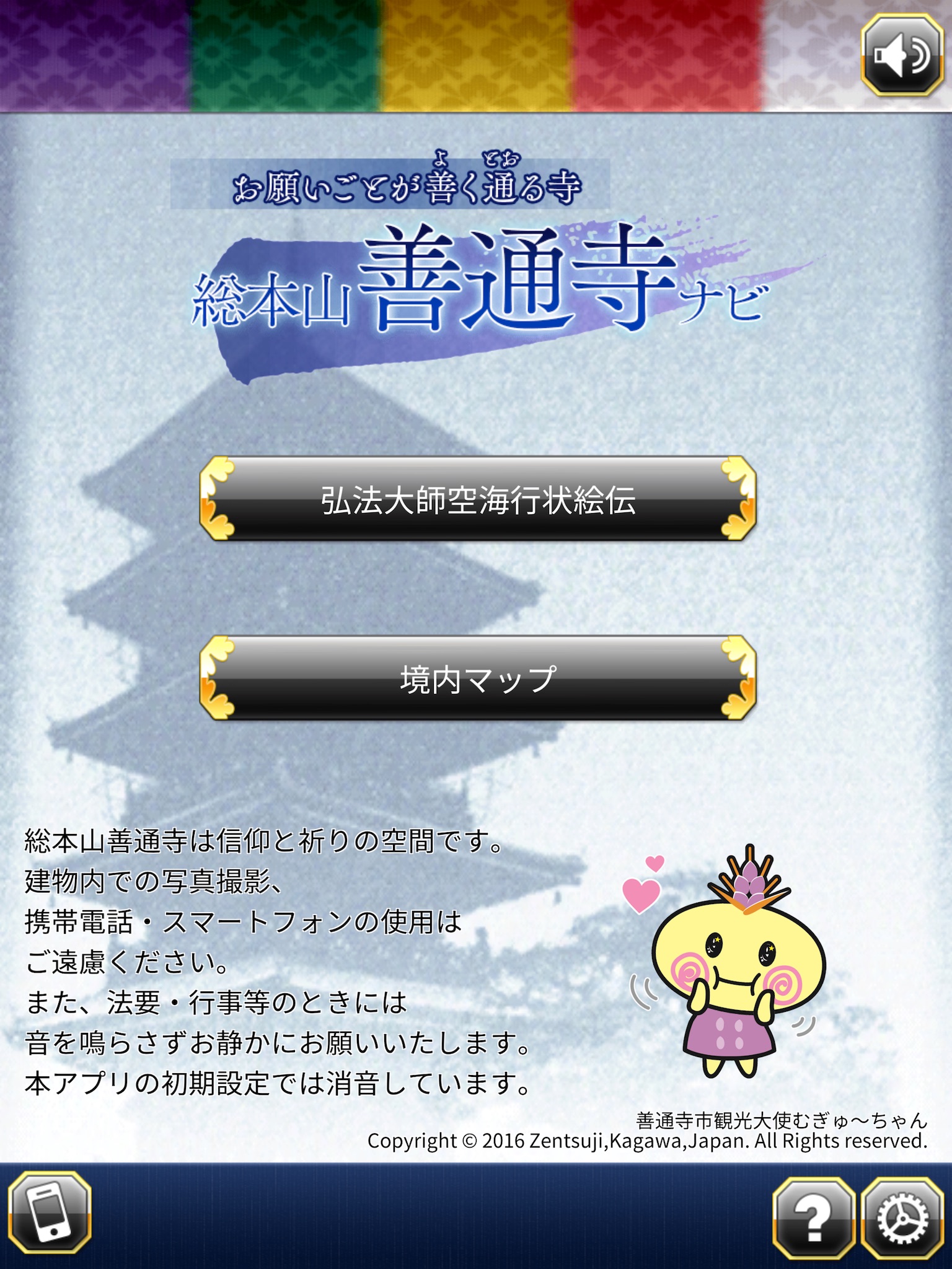 An application that uses AR technology to present the charm of Sōhonzan Zentsūji Temple. This is "The Temple of Answered Prayers - Sōhonzan Zentsūji Temple Navi". Read various commentaries on Zentsūji Temple, and use AR technology to recreate the finer details to more deeply understand the temple. In addition, you can enjoy "The Life of Kōbō-Daishi Kūkai - in pictures," a biography of the Japanese monk created for the Kagawa Prefecture Zentsūji First High School Department of Design Graduation Ceremony 2012. Together Mugyu-chan to be Zentsuji City tourism ambassador can also AR commemorative photo. Download "The Temple of Answered Prayers - Sōhonzan Zentsūji Temple Navi" and go and visit the real Sōhonzan Zentsūji Temple.